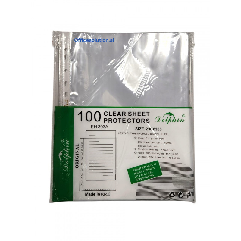 Quality polypropylene (PP) material is resistant and flexible. Glossy surface for a clean and attractive look A4 format (230x305mm) fits perfectly for standard documents. With top opening for easy insertion and removal of papers. Perfect for ring binders or file folders with reinforced holes on the side. Pack of 100 pieces.