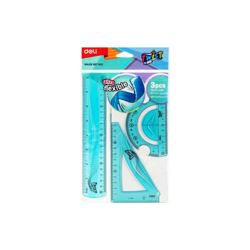 Deli Ruler Set consists of 3 parts. 20cm Ruler, 180 degree Protractor, 90 degree Triangular Ruler.